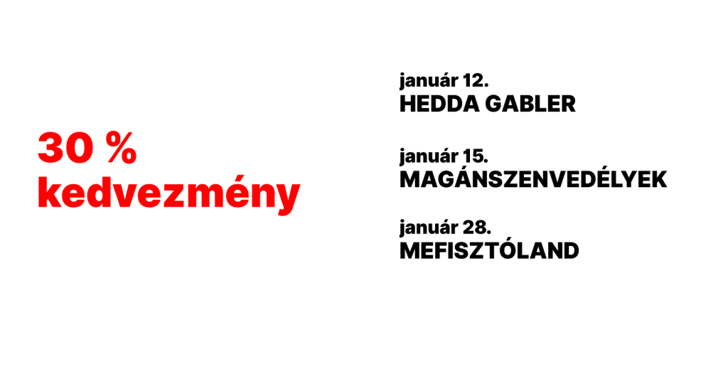 A Katona József Színház januárban is izgalmas előadásokkal várja a színházkedvelő alumni tagokat, ráadásul 30% kedvezménnyel. Január 12-én látható Székely Kriszta rendezésében az Ibsen-klasszikus, a Hedda Gabler, amely a tökéletesnek látszó élet mögötti belső feszültségeket és elfojtásokat bontja ki. Január 15-én a Magánszenvedélyek című esten Máté Gábor és Bezerédi Zoltán tolmácsolásában hallhatók részletek többek között Krasznahorkai László és Esterházy Péter műveiből. Január 28-án pedig Dömötör András rendezésében a Mefisztóland kerül színre, amely egy színházon belüli hatalmi játszma és morális kompromisszumok történetét tárja a nézők elé. A kedvezmény online jegyvásárláskor a KTNBPST kuponkód megadásával érvényesíthető 2026. január 28-ig.